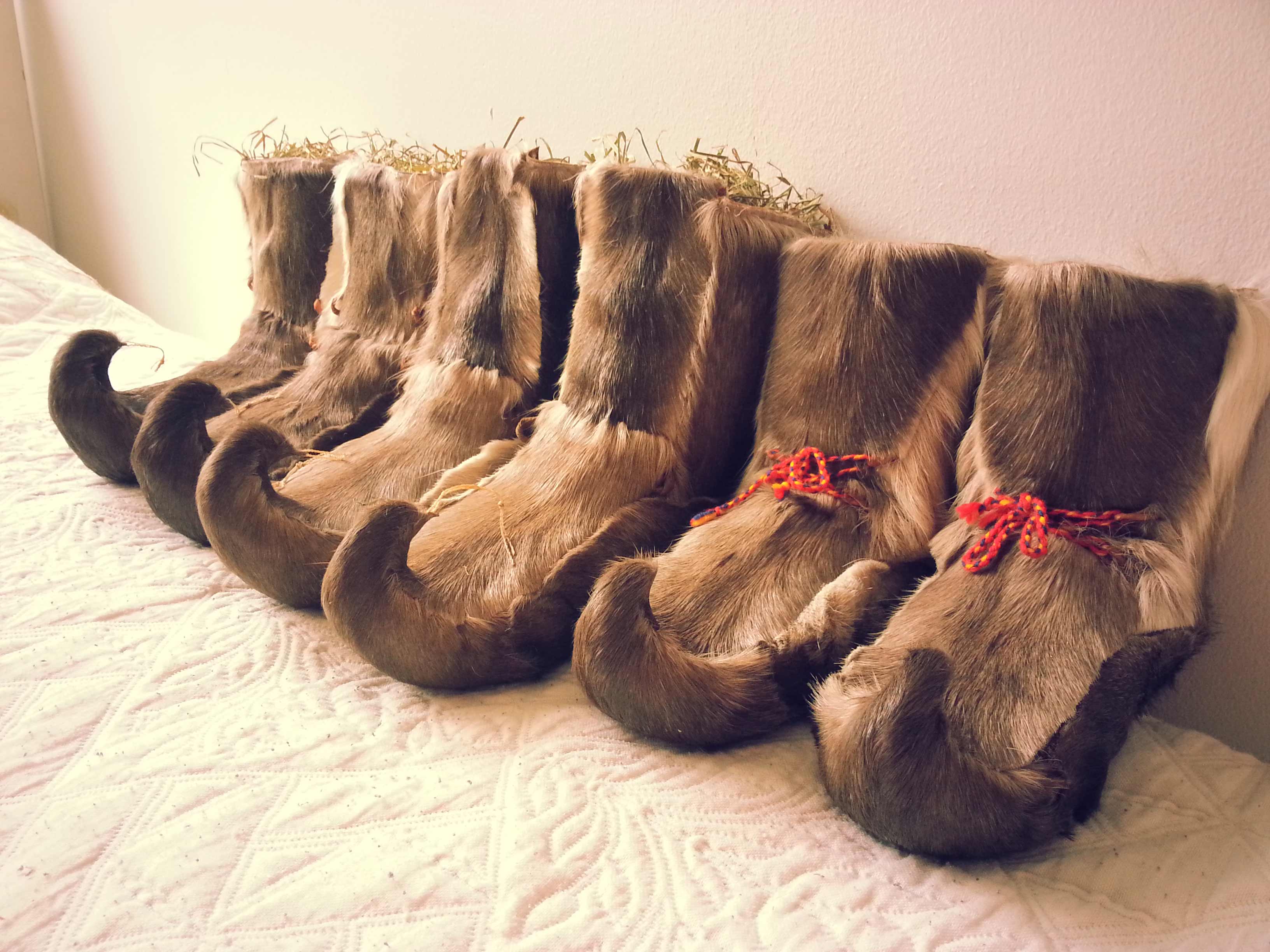 ”[New] fur hoes, mine and my daughters […] they are filled with hay, so that they will dry and harden to that shape. […] I use furshoes in a daily basis, when it is very cold. My eldest daughter don’t use them so much anymore, probably due to her friends in school. But when we go to grandma’s, she wears them, they are for dry frosty weather […] I don’t even have a decent regular winter shoes, and I rather use furshoes, since they feel more comfortable.” (~ 30, female, artisan and student in nursing)